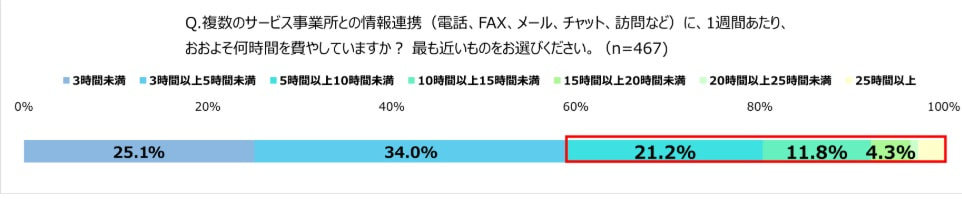 一方で、1週間あたり「3時間未満」との回答も25.1%あり、情報連携に割く時間にはばらつきが見られます。