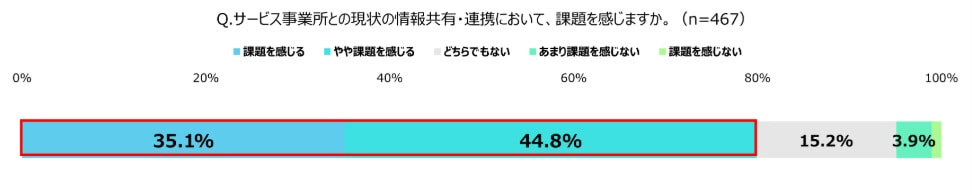 日常的な情報連携については、課題感を持っているケアマネジャーも多く、実際に回答者の約8割が「課題を感じている」と回答しています。