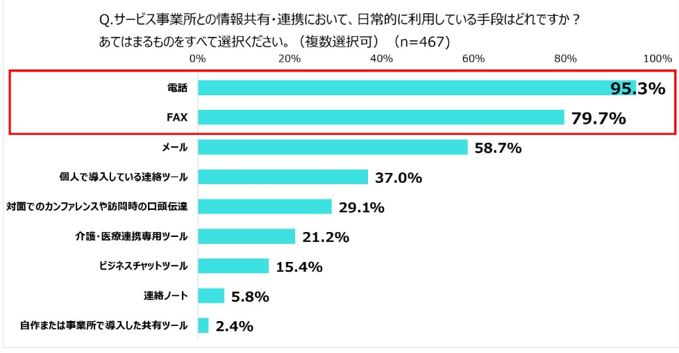 居宅介護支援事業所の業務効率化を進めるうえで、サービス事業所との情報連携の手段には、改善の余地がありそうです。