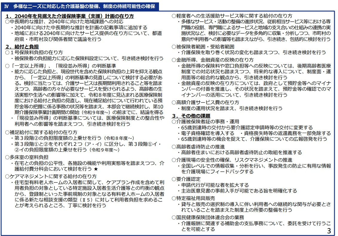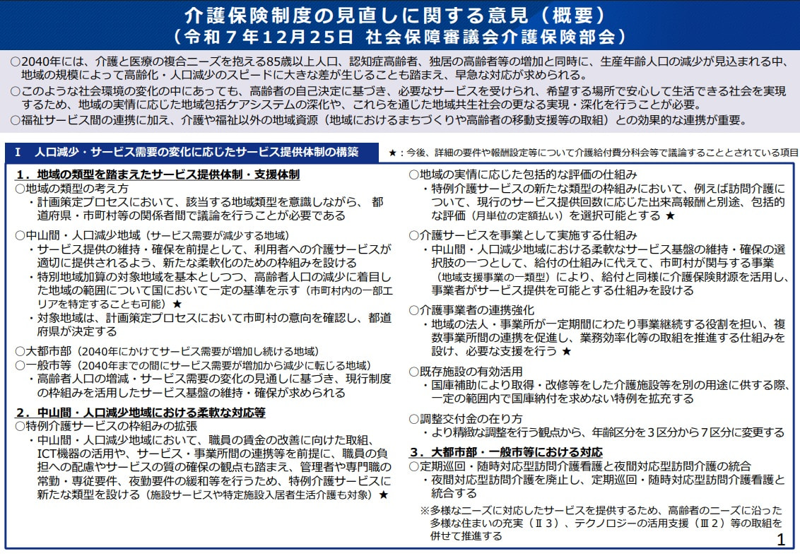2027年度介護保険制度改定に向けて、2025年12月25日に社会保障審議会・介護保険部会で最終的な「介護保険制度の見直しに関する意見」が取りまとめられた。