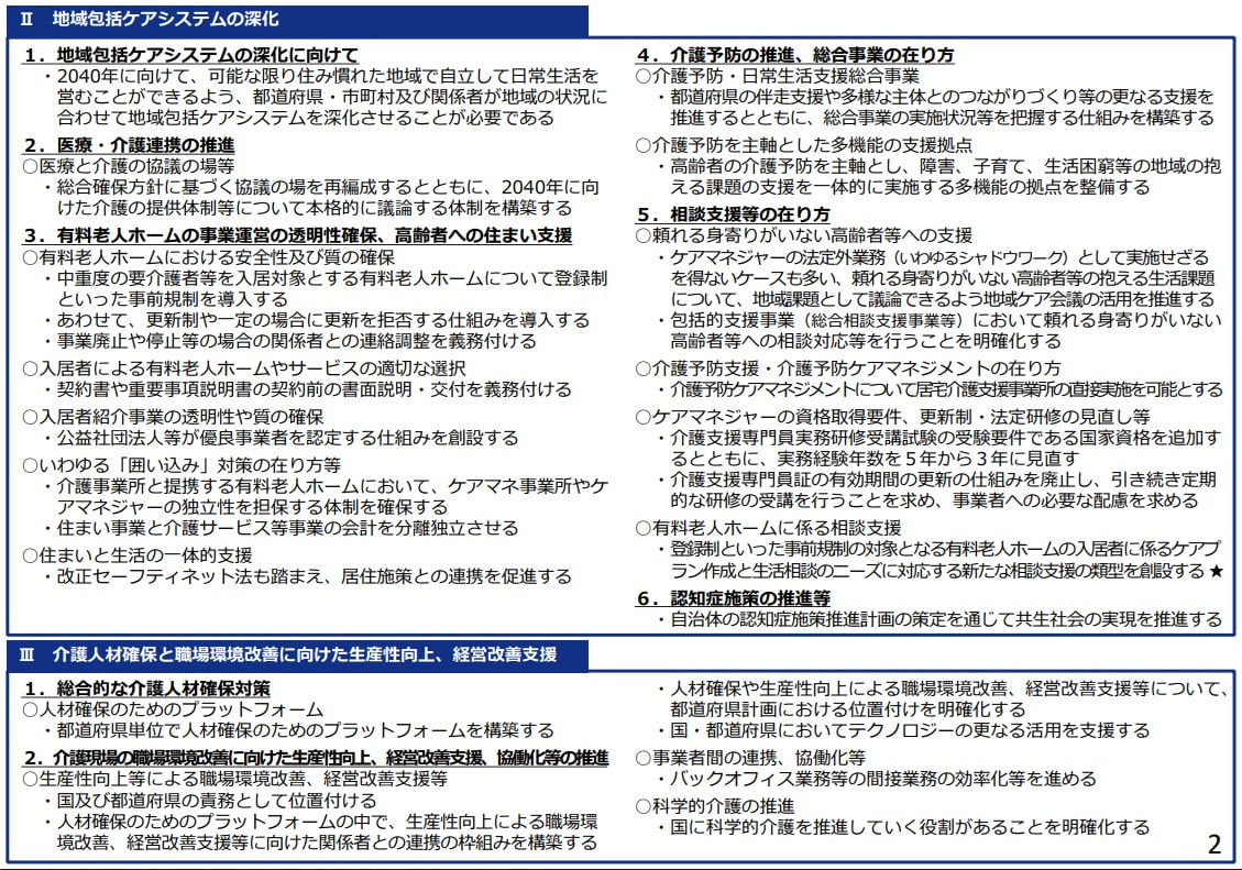 意見書の取りまとめにあたっては人口減少地域でのサービス維持と都市部における高齢者住まいの規制強化について議論が交わされたほか、政治的に最も対立が顕著となった利用者の負担増問題に至るまで、広範な論点に一定の決着を見た。
