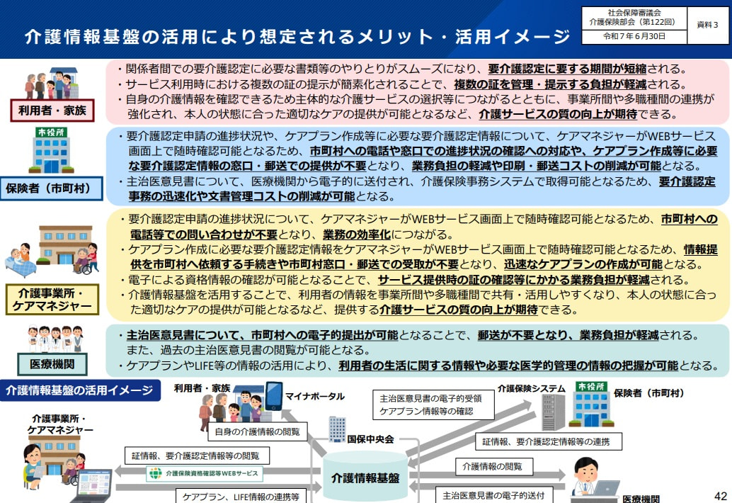 厚労省は、介護情報基盤の導入によって期待される効果を、関係主体ごとに次のように示しています。