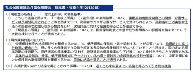 しかし社保審・介護保険部会の委員の間では、高齢者を取り巻く生活環境の厳しさを踏まえ、利用者負担の増加による悪影響を危惧する声が根強く、保険料上昇を抑制するために見直しが必要だとする意見とで対立する構図となっています。 22年12月の同部会の意見書では集約に至らず「次期計画に向けて結論を得ることが適当」として23年の夏に判断は先送りされましたが、その後も結論が出ない状況が続いています。