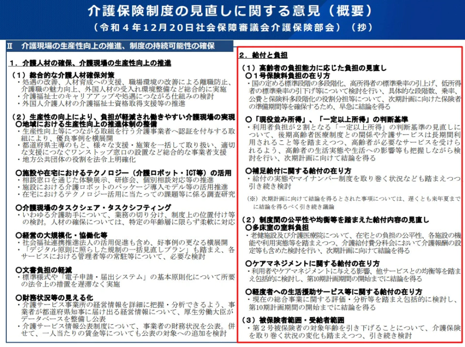 2割負担の対象範囲の拡大やケアマネジメントの利用者負担の導入を巡っては、歳出抑制の観点から毎年、財政制度等審議会の建議でも言及されています。