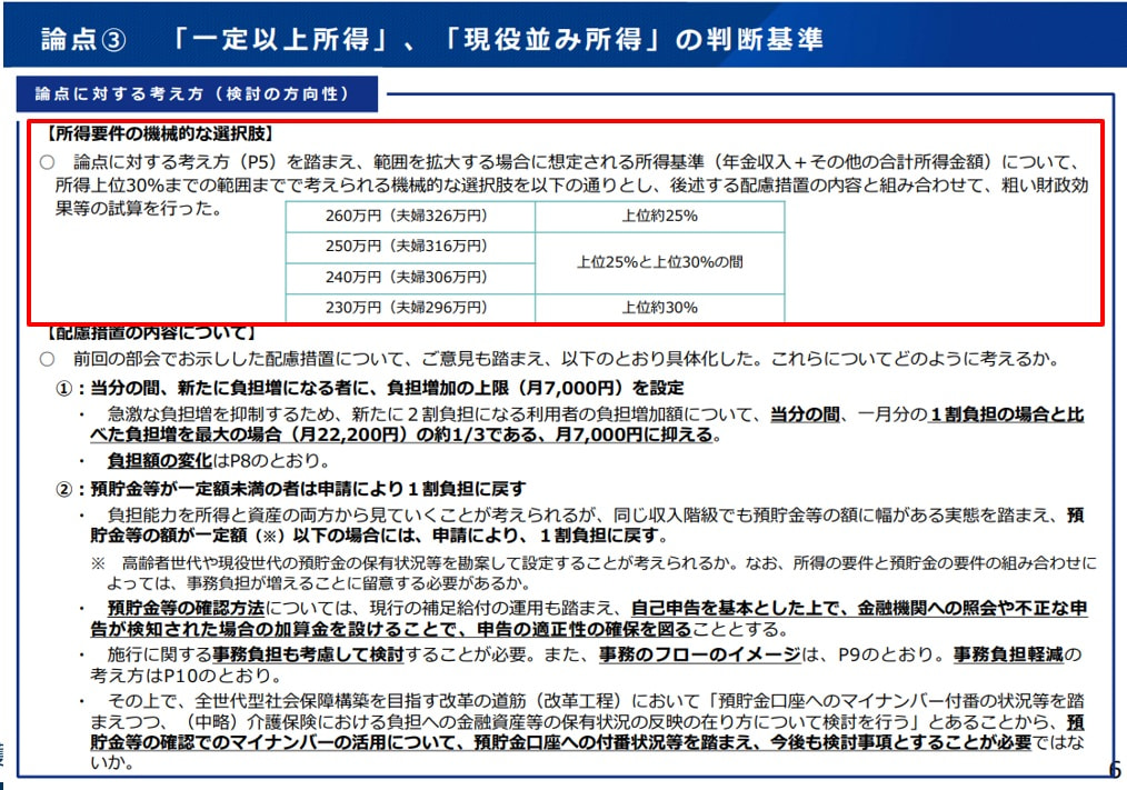 また、日本医師会の江澤和彦委員からは「預貯金額が同じでも、年齢や余命によって必要な金額は異なる」として、一律の資産基準に対する懸念も示されました。