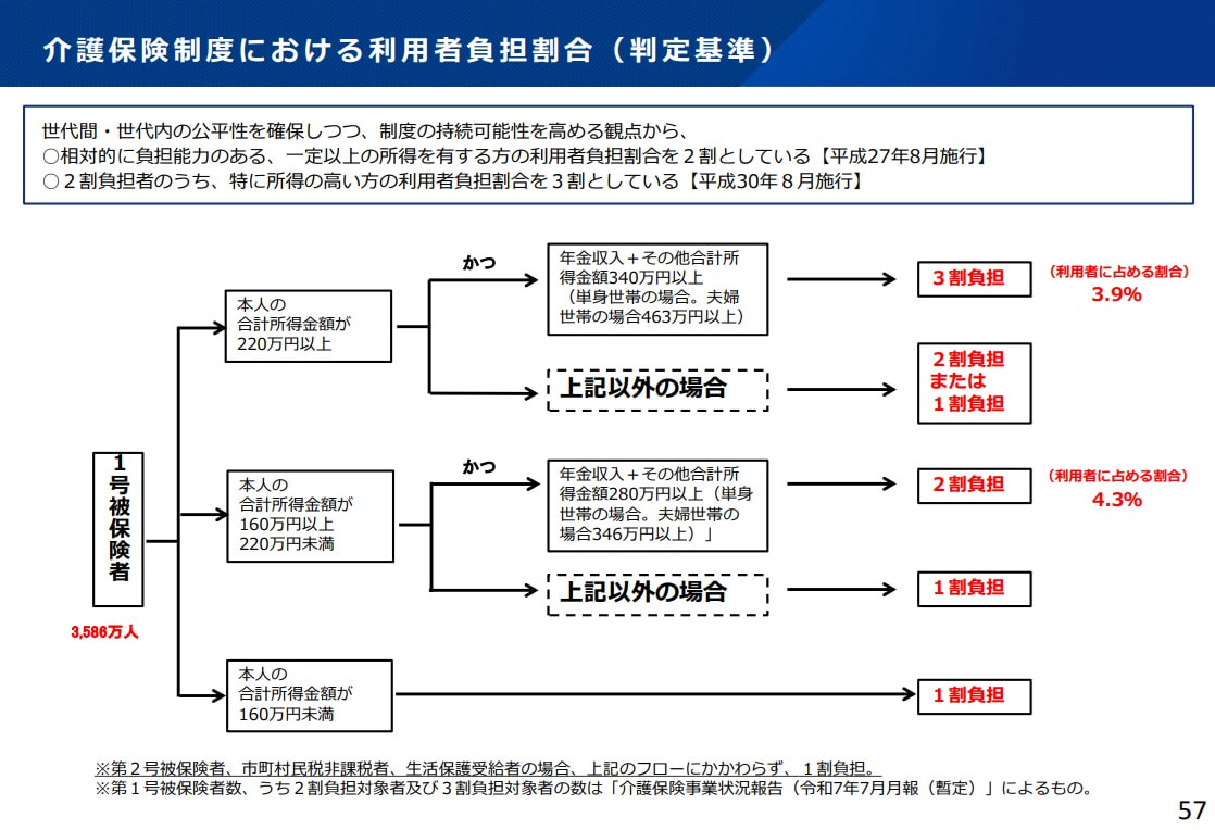 現在、介護保険の利用者負担は原則1割ですが、「一定以上所得者(単身世帯で年収280万円以上)」は2割、「現役並み所得者(同340万円以上)」は3割となっています。