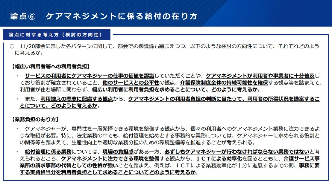 このうち、争点となっているのがケアマネジメントへの自己負担導入です。