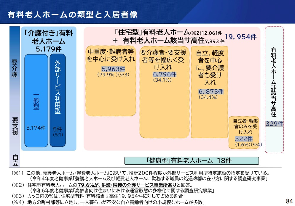 このうち、住宅型有料老人ホームを対象とする理由について厚労省は、一部の有料老人ホームでは要介護者が集まって住み、要介護者へのサービス提供を行う機能があるとして「自宅等の一般的な在宅とは異なる」と説明しています。その上で、ケアプラン作成と介護サービス提供を実施し、一体的に利用者負担の対象としている「施設サービス」や「特定施設入居者生活介護」との均衡を図る方向性を示しました。