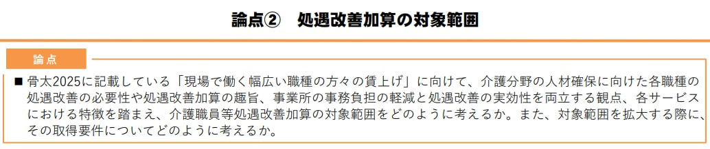 また、介護職員等処遇改善加算の見直しも論点となっています。