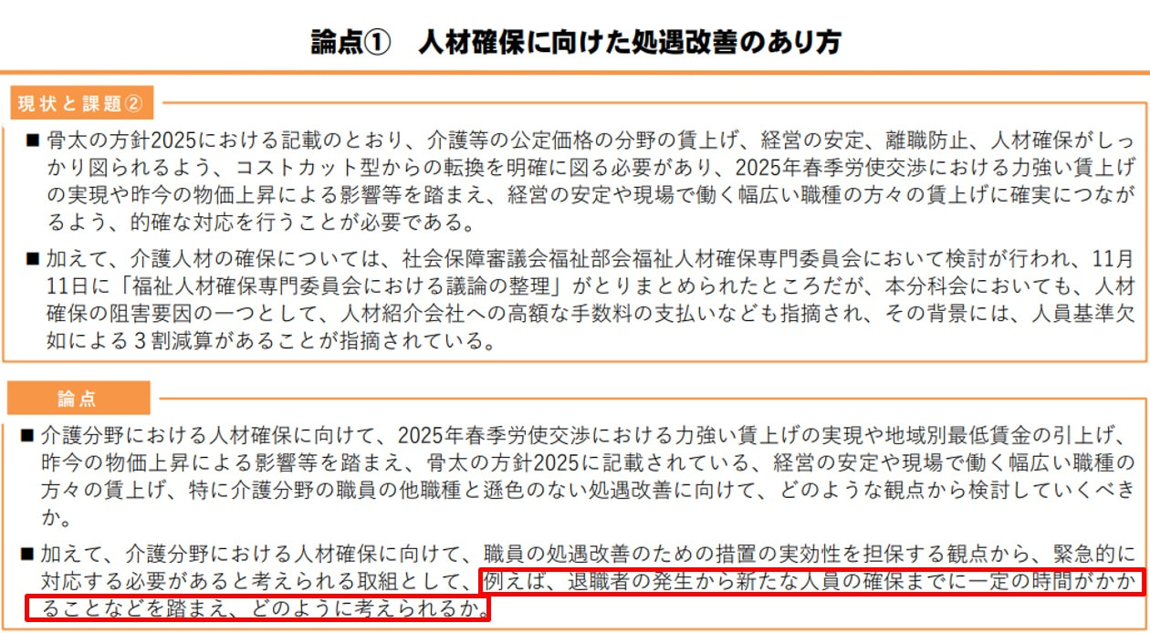 同日開かれた社保審・介護給付費分科会はこの政府方針を受け、処遇改善や人材確保のための施策について検討をはじめました。