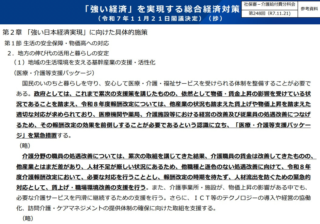 11月21日に閣議決定された政府の経済対策(「「強い経済」を実現する総合経済対策」)には、介護事業者や医療機関向けの財政支援策が示されています。
